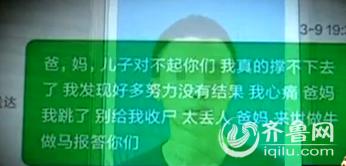 据山东广播电视台生活频道《生活帮》报道,河南大学生给父母的短信里称:“爸妈,儿子对不起你们,我真的撑不下去了,我发现好多努力没有结果,我心痛,爸妈我跳了,别给我收尸体,太丢人,爸妈,来世做牛做马报答你们。”