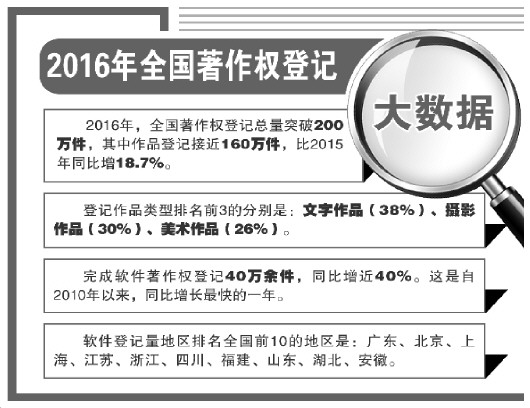 国家版权局近日通报了2016年全国著作权登记情况。记者今天从国家版权局获悉,2016年全国著作权登记总量突破200万件,其中作品登记接近160万件,比2015年同比增长18.7%。