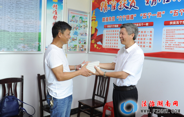 在司法厅驻村扶贫工作队队长周爱梧及村干部带领下,湖南省司法厅法制宣传处和政策法规处两个支部分别走访了白水洞村4户贫困户。厅党组成员、副厅长唐世月将慰问金送到贫困群众手中,并与贫困村民进行交流,了解贫困户的家庭状况、收入情况、就业务工、等实际信息,并鼓励贫困户树立脱贫信心,争取早日脱贫摘帽。