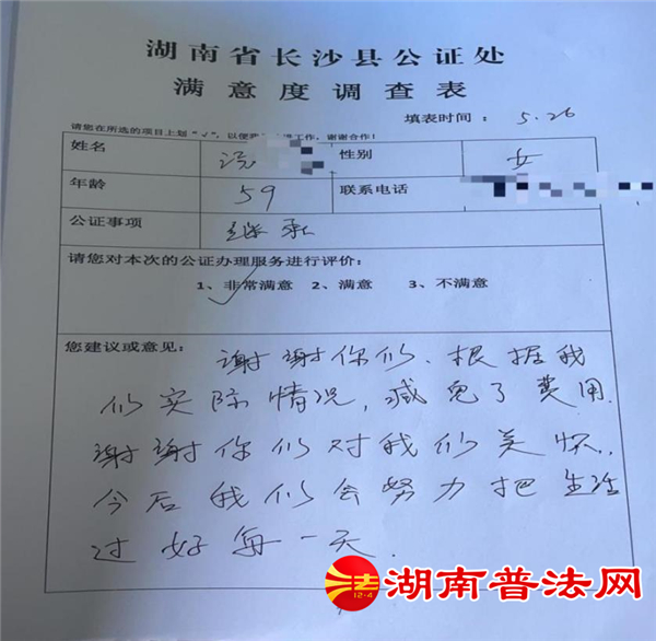 长沙县公证处公证员周杨了解其详细情况后,当天受理了汤阿姨的公证申请。鉴于丈夫去世后,汤阿姨一方面精神上受到了很大的打击,另一方面自身患有抑郁症需长期坚持药物治疗,家里还有一个未成年的女儿需要抚养,家庭情况十分困难。完全符合公证费减免的规定,公证员周杨在向审核领导汇报情况后减免了汤阿姨本次办理公证的全部费用。临走时,汤阿姨竖起大拇指为公证员点赞,并在“长沙县公证处满意度调查表”上写出了对本次公证服务的满意程度以及对生活的满满信心。