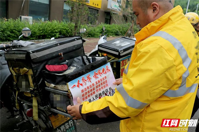 依托新业态传播优势,衡东县组建“快递小哥征兵宣传先锋队”,遴选百余名校验合格的快递员担任“流动征兵宣传员”。他们在快递车上张贴“参军报国正当时”等主题标语,在配送包裹时同步送上征兵宣传手册和“五件套”,用“送餐路上传政策、快递包裹递担当”的创新模式,让红色征兵理念随车轮穿梭城乡街巷,构建起无死角、全覆盖的流动宣传网络。同时,全县50余家快递驿站设立固定宣传点,工作人员主动为咨询群众解读政策,让征兵宣传融入民生服务链条。
