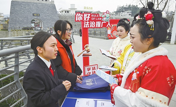 时刻新闻 —分享— 图为普法现场。近日,湖南省新晃侗族自治县人民法院将普法课堂搬进百年龙溪古镇,创新开展“我是法治推广人”专题普法宣传活动。此次活动特别邀请返乡大学生加入法治宣传队伍,以青春力量助力法治文化传播。 来源:人民法院报 编辑:王媛