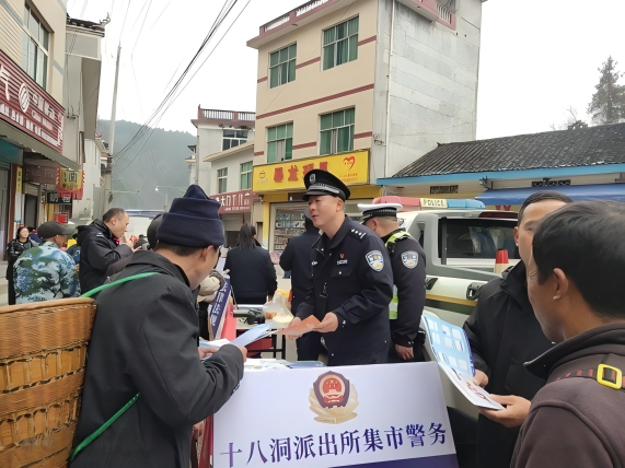 针对辖区偏远地区办事难、办证远,群众无法及时到窗口办理业务。十八洞派出所民警早早来到集市,当起“摆摊人”,一条横幅,几张桌子、几把凳子、一台移动设备、一沓厚厚的宣传资料,为群众送来户籍业务和安全生产常识、防电信网络诈骗、防火防盗等各种贴心叮嘱和优质服务。很快,赶集群众就将民警“摊位”围得水泄不通,民辅警用通俗易懂的语言,通过真实案例展示、面对面讲解、以案释法等方式,向群众普及法律法规、防盗抢、防电信网络诈骗、防非法集资、防养老诈骗等知识,讲解电信诈骗常见的种类、手段和识骗防骗小妙招,引导广大群众下载安装“国家反诈中心App”。