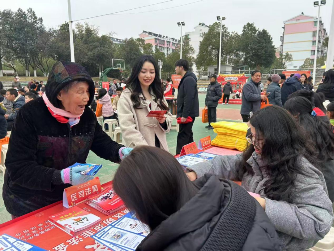 一旁的“法治春联书写台”墨香四溢。大学生志愿者挥毫泼墨,将法治精神书写进一副副火红春联中。“法典护家万事兴,春风化雨千家暖”“利剑护蕾芳华绽,法治润心岁月安”等法治春联,既传递着传统节日的喜庆,又播撒下尊法学法的种子。居民们争相领取这份特殊的“精神年货”,纷纷表示要将“法联”贴在家门,把平安守在心间。