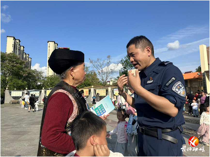 地面上,巡特警队员、派出所民警向过往家长、老师发放反诈宣传手册,同时结合近期典型诈骗案例,详细讲解刷单返利诈骗、冒充老师收费诈骗、网络交友诈骗等常见诈骗手段,传授“不轻信、不透露、不转账”的反诈技巧。