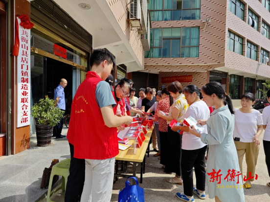 (工作人员正在发放法治宣传资料。谢芳 摄)