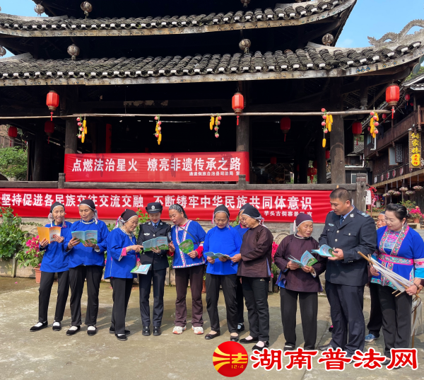 湖南普法网4月21日讯(通讯员 龚静)“红军远征难,自此处处有‘通道’。法治政策赖(好),家富国更强……”4月21日,在通道县皇都侗文化村、芋头古侗寨,侗族群众自编自演的法治歌舞在不停地传唱,吸引了广大游客驻足观看与喝彩。这是通道县司法局运用非遗传统文化的独特魅力,巧借侗族传统节日“大戊梁”歌会为载体开展的一次具有少数民族特色的法治宣传活动。