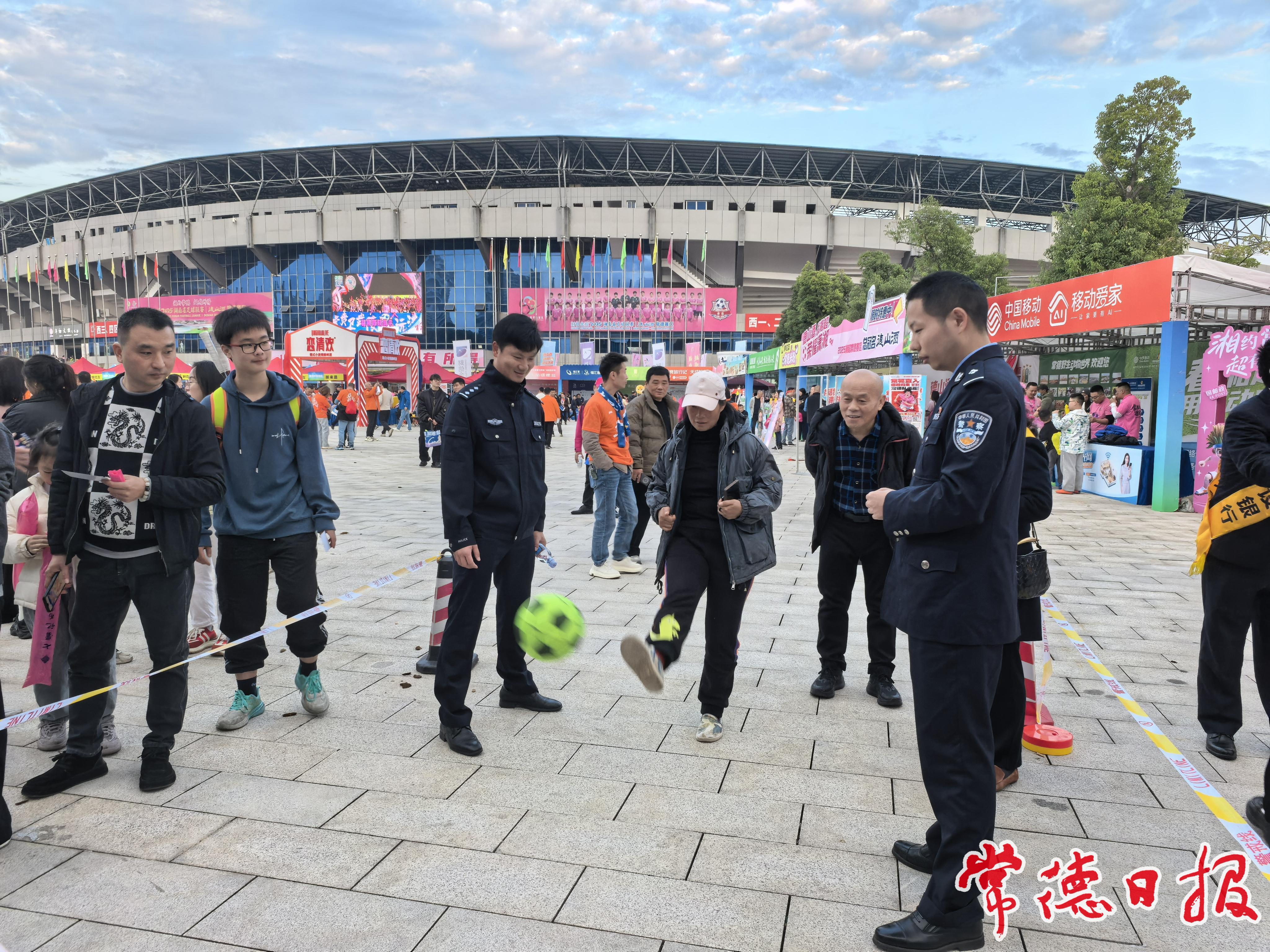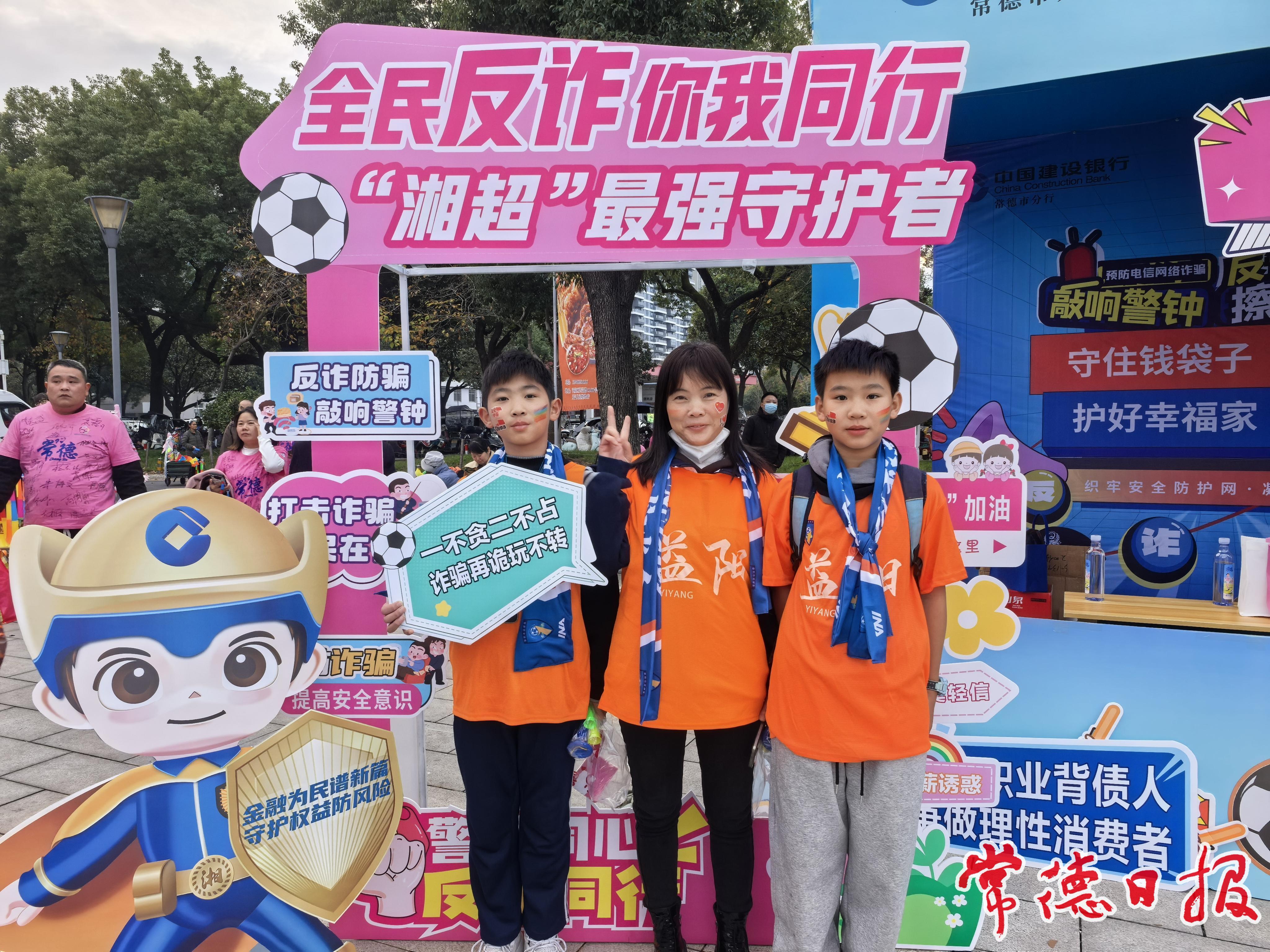 “加油,射门!守住咱的钱袋子!”11月22日下午,常德市体育中心广场上,阵阵助威声与欢笑声此起彼伏。在当晚湘超联赛常德主场迎战益阳的焦点战打响前,一场特别的“反诈训练赛”率先火热开场。常德市公安局联合中国建设银行常德市分行,将“警银联手筑防线 湘超同心拒诈骗”主题宣传课堂直接“搬”到了赛场边,吸引了近五千名市民踊跃参与,让防骗知识在欢声笑语中入脑入心。