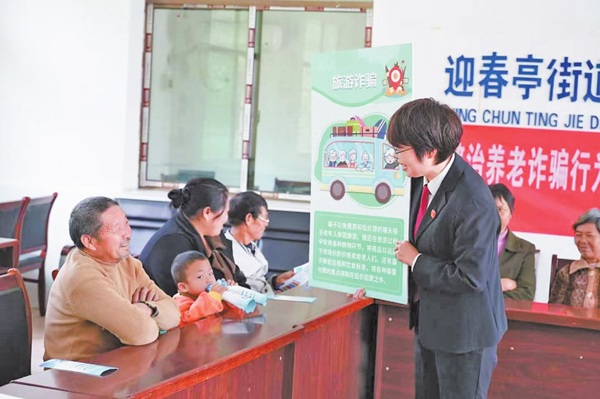 近日,湖南省武冈市人民法院干警走进迎春亭街道太平村开展防范养老诈骗普法宣传活动。活动现场,干警们通过知识宣讲、以案释法、现场答疑等形式,面对面向老年人讲解各种以“养老”为名的诈骗手段以及识别、防范技巧,帮助老年人守住养老“钱袋子”。